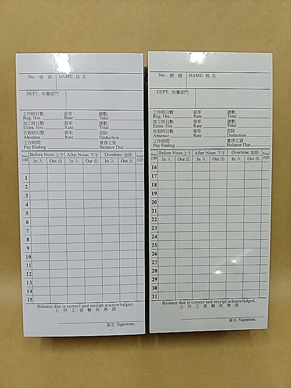 Time Card Double Side 100's 數量
